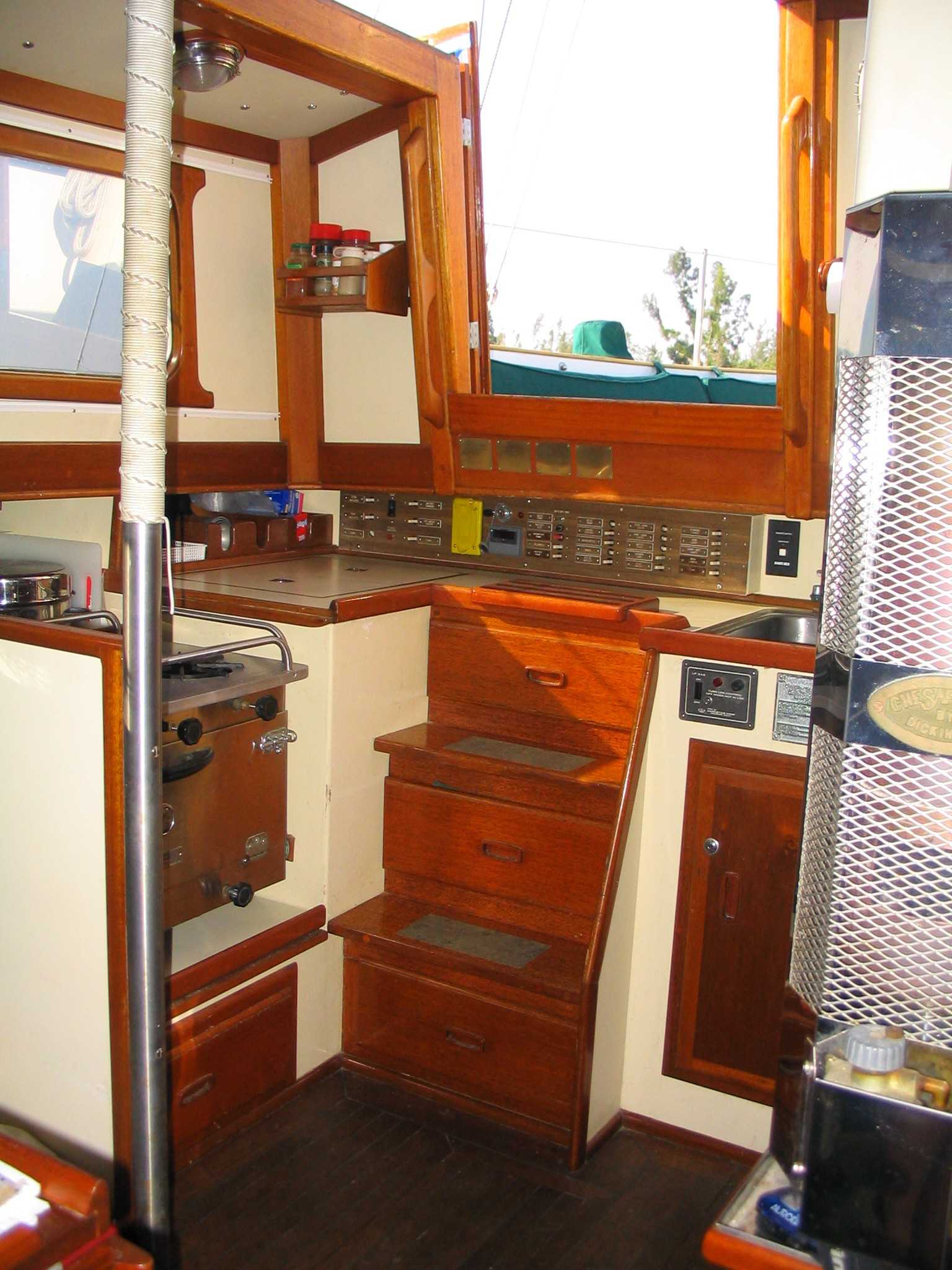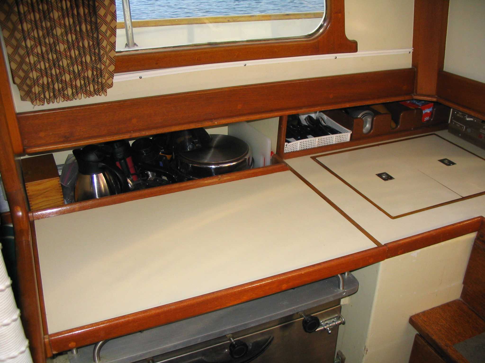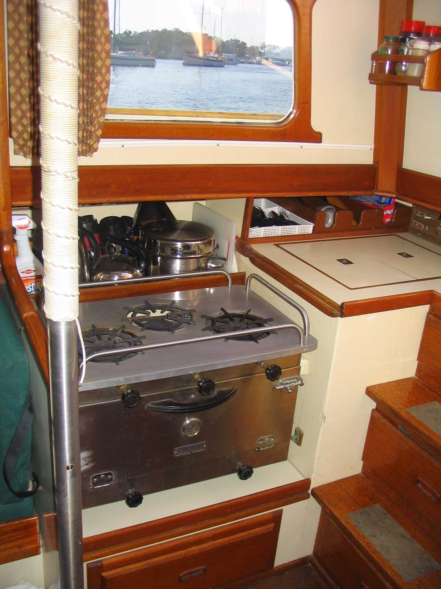 stove is 3-burner Luke with oven. There is substantial storage outboard