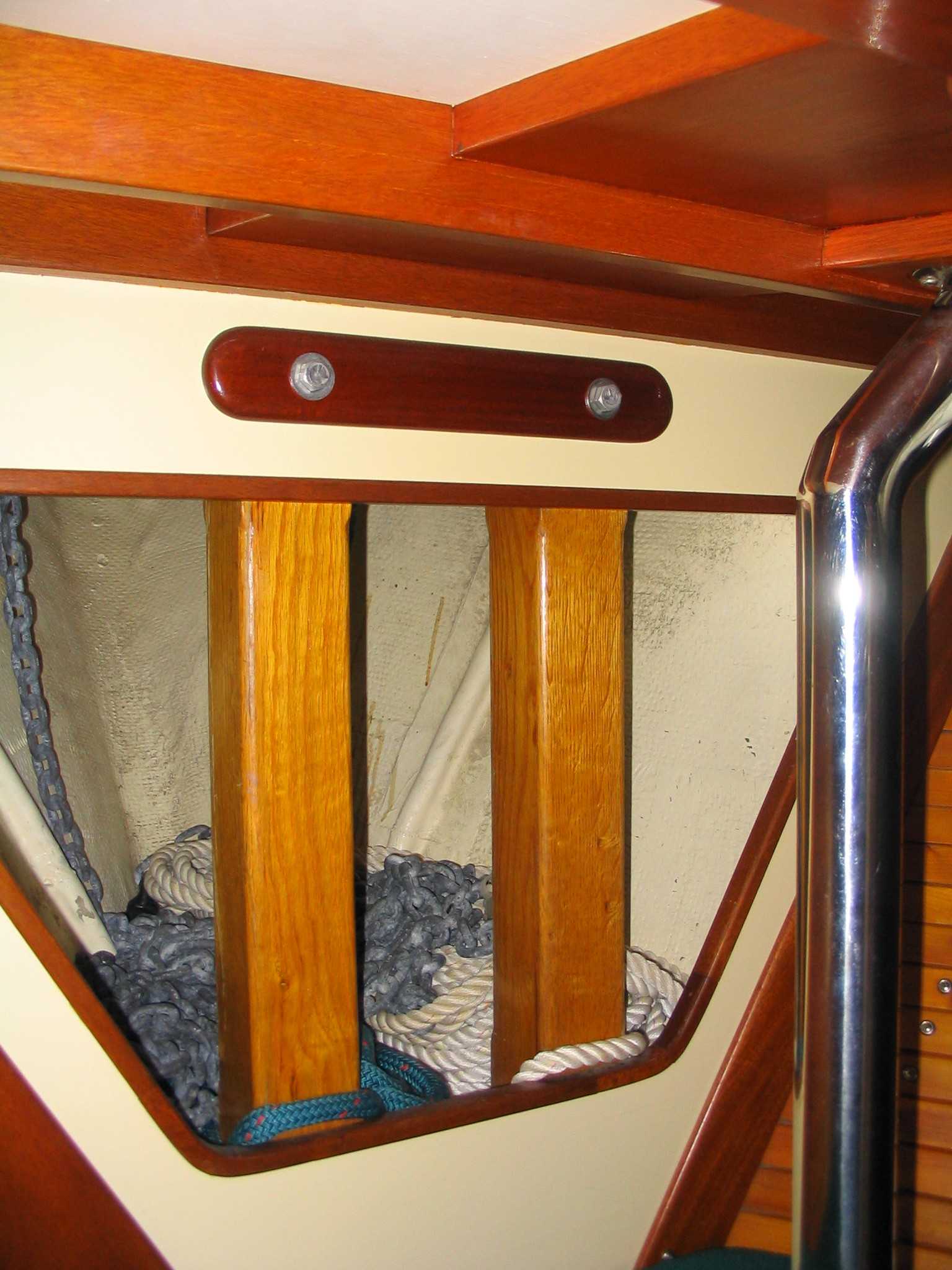 Forward is the chain/rode locker for the two deck-stowed anchors.